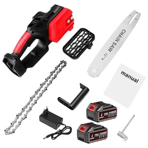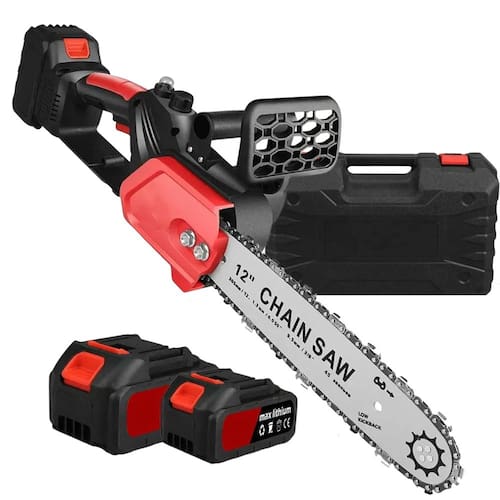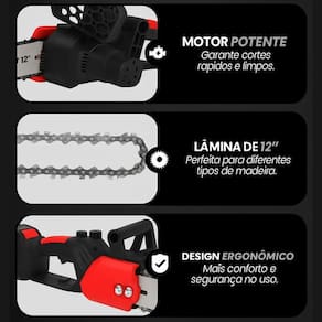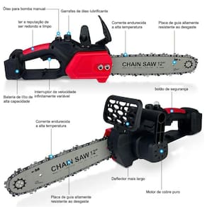 Equipada com sabre de 12" e duas baterias de longa duração, a motosserra é indispensável para qualquer pessoa que possua jardim, árvores, pomares,etc. e profissionais da jardinagem.