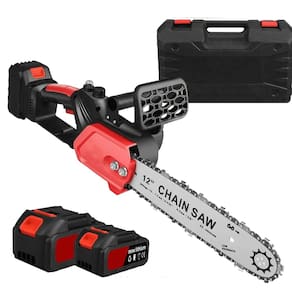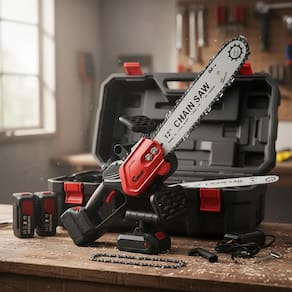 Equipada com sabre de 12" e duas baterias de longa duração, a motosserra é indispensável para qualquer pessoa que possua jardim, árvores, pomares,etc. e profissionais da jardinagem.