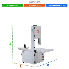 Especificações: - Mesa fixa ampla (490 560 mm): facilita o manuseio e cortes precisos - Lâmina de serra de 181 cm: cortes rápidos e uniformes - Carenagem em aço inox: resistência e higiene para uso intenso - Motor: 1/2 cv, Monofásico - Altura do corte: 300 mm - Dimensões: 640 x 550 x 920 mm