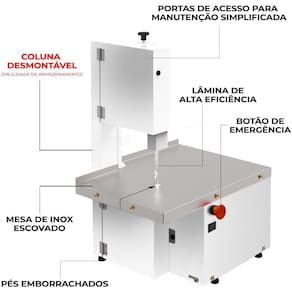 Com regulador de velocidade industrial integrado Possui estrutura robusta em aço carbono inoxidável Coluna desmontável para fácil transporte e montagem Acompanha lâmina de serra resistente e de alta durabilidade Possui sistema de segurança integrado com paralisação total Fabricada 100% de Inox próprio para o contato com alimentos Motor de alta tecnologia com placa integrada e 1/3 cv de potência Sistema tecnológico RED-Plus, capaz de aumentar a vida útil do motor e diminuir sua manutenção