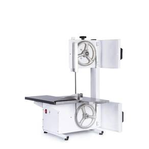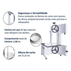 CARACTERÍSTICAS TÉCNICAS: Motor: 1/3 CV; Tipo: Monofásica; Voltagem: 110V ou 220V (chave seletora); Lâmina (fita estendida): 1.460 mm; Volantes: Ferro fundido; Mesa: Inox escovado; Altura útil de corte: 21 cm; Mesa fixa; Área útil da mesa: 32 x 36 cm (L x P); Estrutura com pintura epóxi branca; Protetor de lâmina.