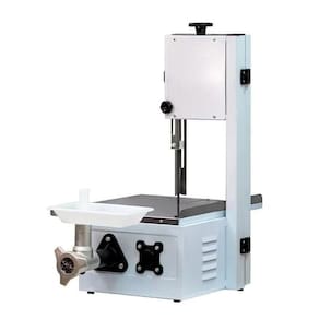 Aplicação: - Residêncial e comercial - Capaz de cortar grandes peças de carne com ossos além de possuir mecanismo para moer as mesmas - Sua serra possui 181 cm de comprimento e tem uma mesa fixa para apoiar a carne, sua capacidade de corte é de peças com 29,5 cm de altura e 20,5 cm de largura - Possibilita serrar carnes, aves e peixes, moer carnes e fazer embutidos
