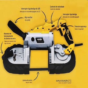 Serra Fita Manual SFV1100 127V 6 Velocidades Luz Led Vonder Desicon Ferragens A serra fita manual Vonder 127V é uma ferramenta elétrica que realiza o corte de materiais muito espessos e com grande dureza, através de uma fita de serra que realiza movimentos constantes., além de permitir que você faça cortes, em diversos tamanhos e formatos. Dados Técnicos: Dupla isolaçãoMarca: Vonder Referência: 6001110110Botão trava de segurança que não permite acionamentos involuntáriosLuz de LED para iluminação da área de trabalho.Potência (W): 1.100 WCapacidade de corte: 127 mm x 120 mmComprimento da lâmina: 1140,0 mmLargura da lâmina (mm): 13 mmEspessura da lâmina: 0,65 mmRotação (rpm): 80/min - 270/minÍndice de proteção (IP): IP20Frequência: 50 Hz/60 HzTensão (V): 127 VDimensões (C x L x A): 520 mm x 300 mm x 300 mmMassa aproximada.: 6,5 kgAceleração transmitida nas mãos - braços do operador - ah (m/s): 6,6 m/sIncerteza da aceleração transmitida nas mãos - braços do operador - k (m/s): 1,5 m/sTipo de velocidade: VariávelVelocidade da lâmina: Velocidade 1: 0,6 m/s - Velocidade 2: 0,74 m/s - Velocidade 3: 1,2 m/s - Velocidade 4: 1,62 m/s - Velocidade 5: 1,96 m/s - Velocidade 6: 2,2 m/s Aplicação: A serra fita manual Vonder 127V possui aplicações mais diversas do que pode parecer à primeira vista. Você pode utilizá-la nos trabalhos de marcenaria e manutenção, artesanato, corte de plásticos e metais, chapas e MDF e afins. Conteúdo da Embalagem: 1 Serra fita manual. Acompanha: 1 chave allen nº 4, 1 chave allen nº 6 e 1 lâmina Imagens meramente ilustrativas