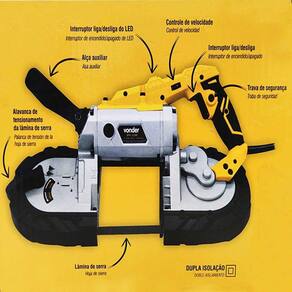 Serra Fita Manual SFV1100 127V 6 Velocidades Luz Led Vonder Desicon Ferragens A serra fita manual Vonder 127V é uma ferramenta elétrica que realiza o corte de materiais muito espessos e com grande dureza, através de uma fita de serra que realiza movimentos constantes., além de permitir que você faça cortes, em diversos tamanhos e formatos. Dados Técnicos: Dupla isolaçãoMarca: Vonder Referência: 6001110110Botão trava de segurança que não permite acionamentos involuntáriosLuz de LED para iluminação da área de trabalho.Potência (W): 1.100 WCapacidade de corte: 127 mm x 120 mmComprimento da lâmina: 1140,0 mmLargura da lâmina (mm): 13 mmEspessura da lâmina: 0,65 mmRotação (rpm): 80/min - 270/minÍndice de proteção (IP): IP20Frequência: 50 Hz/60 HzTensão (V): 127 VDimensões (C x L x A): 520 mm x 300 mm x 300 mmMassa aproximada.: 6,5 kgAceleração transmitida nas mãos - braços do operador - ah (m/s): 6,6 m/sIncerteza da aceleração transmitida nas mãos - braços do operador - k (m/s): 1,5 m/sTipo de velocidade: VariávelVelocidade da lâmina: Velocidade 1: 0,6 m/s - Velocidade 2: 0,74 m/s - Velocidade 3: 1,2 m/s - Velocidade 4: 1,62 m/s - Velocidade 5: 1,96 m/s - Velocidade 6: 2,2 m/s Aplicação: A serra fita manual Vonder 127V possui aplicações mais diversas do que pode parecer à primeira vista. Você pode utilizá-la nos trabalhos de marcenaria e manutenção, artesanato, corte de plásticos e metais, chapas e MDF e afins. Conteúdo da Embalagem: 1 Serra fita manual. Acompanha: 1 chave allen nº 4, 1 chave allen nº 6 e 1 lâmina Imagens meramente ilustrativas