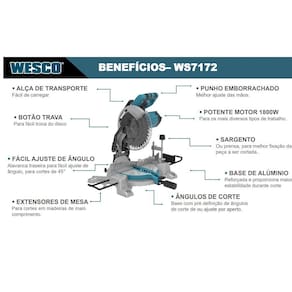 Serra meia esquadria 10" 1800W WS7172 WescoCaracterísticas:A serra meia esquadria WS7172 / WS7172U possui maior potencia, velocidade de disco e maior profundidade de disco, que trás mais qualidade e precisão no trabalho a ser feito.Com sua durabilidade da escova de carvão de 110 horas é possível fazer muitos trabalhos, trazendo mais agilidade no dia a dia. Já com os ajustes de cortes é possível ter mais precisão no corte.Características principais:- Vida útil: durabilidade da escova de carvão: 320 horas- Estabilidade: Maior peso na base, para estabilidade de corte e menorvibração durante o corte.- Precisão de corte: ajuste de corte cortes mais precisos- Base reforçada: reforço da base e graduação direto no metal- Menor peso, maior vibração durante o corte- Troca fácil das escovas de carvão- 9 ajustes de corte pré-definidos- Funil direcionador de pó- Acessórios para corte repetitivo e extensoresEspecificações:- Marca: Wesco- Modelo: WS7172U (110V) / WS7172 (220V)- Voltagem: 110V ou 220V- Potencia: 1800W- Rotação: 5.000 RPM- Disco de serra: 255 mm X Ø 25,4- Quantidade de dentes: 40 dentes- Corte em ângulo: 0º a + 45º (Corte para esquerda)- Capacidade de corte 90° x 90° : Largura 140 x Altura 70 mm- Capacidade de corte 90° x 45° : Largura 100 x Altura 70 mm- Capacidade de corte 45° x 90°: Largura 135 x Altura 48 mm- Capacidade de corte 45° x 45°: Largura 95 x Altura 48 mm- Carbon brushed : troca fácil- Possui freio de motor? Sim- Peso: 11,7 KgItens que acompanham:- Disco de serra- Saco coletor de pó- Extensor- Sargento- Chave sextavadaIMAGENS MERAMENTE ILUSTRATIVAS