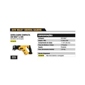 Características: Luz LED brilhante ilumina as superfícies de trabalho escuras para uma melhor visibilidade; Base ajustável giratória oferece versatilidade ao cortar; Abraçadeira de lâmina de 4 posições permite cortes rentes e uma maior versatilidade de posições com alterações da lâmina sem ferramentas; Comprimento da linha de 1-1/8" 28,5 mm oferece uma velocidade de corte rápida; Interruptor de gatilho de velocidade variável com 0-2.900 gpm, oferece controle da lâmina para cortes de precisão; Ergonomia da empunhadura melhorada antiderrapante, para melhor sujeição e menos fadiga; Design compacto e leve permite ao usuário fazer cortes em espaços reduzidos. Especificações: Voltagem: 20V MAX Abraçadeira da lâmina sem ferramentas Abraçadeira da lâmina de 4 posições Comprimento da linha 1-1/8 28,5 mm Golpes/min 0-2.900 gpm Comprimento da lâmina 1-1/8 Comprimento do Golpe: 29mm Comprimento da ferramenta: 14,5 368 mm Peso da ferramenta ferramenta isolada : 2,27Kg Itens Inclusos: 1 Serra sabre compacta 20V Dewalt DCS387B; 1 Manual De Instruções. Obs: Não inclui bateria nem carregador. Garantia De Fábrica: 3 anos. Ean: 885911363006