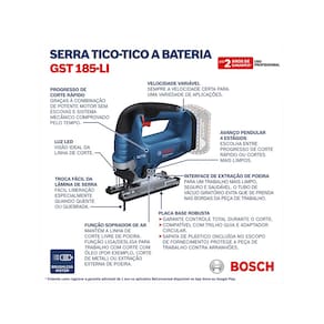 Conteúdo da Embalagem: 1 Serra Tico-Tico GST 185-LI, 1 manual de instruções da ferramenta, 1 lâmina para madeira, 1 placa base de plástico, 1 protetor contra lascas.