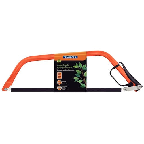 Serrote de Poda Profissional em Arco 21" / 535 mm Tramontina em Aço Carbono -Para ficarem bonitas, suas árvores precisam de cuidados especiais e um deles é a poda. Isso faz com que elas se mantenham lindas e saudáveis, se for realizada com ferramentas específicas e de alta qualidade, como o serrote de poda profissional em arco 21" / 535 mm Tramontina em aço carbono. Sua lâmina flexível conta com dentes de alto grau de afiação, projetados para cortar nos dois sentidos, o que resulta em um corte limpo e sem rebarbas, facilitando a cicatrização do galho. O serrote ainda possui estrutura tubular e protetor de mão, que promove maior robustez, além de proteger suas mãos durante o manuseio. Com a Tramontina você tem alta qualidade, literalmente, na palma da sua mão! Descrição Serrote de Poda Profissional em Arco 21" / 535 mm Tramontina em Aço Carbono