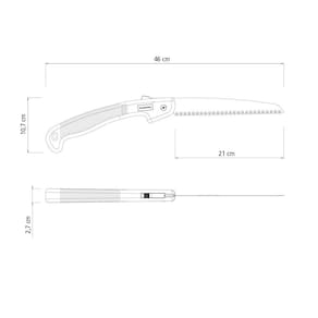 - Especificações Técnicas: Comprimento da lâmina: 8 polegadas / 210 mm Material da lâmina: Aço carbono Material do cabo: Plástico ergonômico Tipo de serrote: Dobrável Peso: 260 g