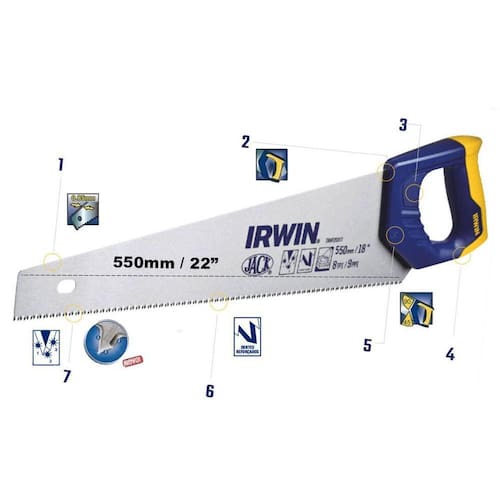 Serrote Fast Jack 550mm/22 pol. IWHT20379 - Irwin CaracterísticasLâmina e Dentes em Aço Temperado com Afiação Triplo Corte, com Comprimento de 22 - 550mmIdeal para Cortes em Madeiras duras e Macias, a Ferramenta Oferece mais Ergonomia, Qualidade e Velocidade Para o Profissional Exigente a Irwin, uma das Mais Tradicionais Fabricantes de Ferramentas e Acessórios de Todo o Mundo, Apresenta a Nova Geração do Serrote Professional Jack de Corte Triplo. Com Fiação Tripla nos Dentes, o Equipamento Oferece uma Velocidade até 25% Superior Quando Comparado aos Modelos Tradicionais, Além de ser Capaz de Realizar Cortes na Ida e na Volta de um Jeito Rápido e Descomplicado. Como Conforto na Execução do Serviço é um Quesito de Extrema Importância, a Nova Geração Possui um Cabo Ergonômico Bi-Material e Anti-Deslizante, Capaz de Suavizar as Aplicações Mais Fortes. A Estabilidade Proporcionada pela Ferramenta Pode Fazer Toda a Diferença na Exatidão do Trabalho. Por Isso, o Produto Possui Descanso de Dedo, para Máximo Controle; Cabo Soldado com Ultrassom, para Uma Maior Segurança, Durabilidade e Eficiência; e uma Lâmina de 0.85mm em Aço Temperado, para uma Maior Estabilidade e Poder de Corte.Assim como a Lâmina, os Dentes do Serrote Também São Temperados, o que Garante a Afiação mais Durável e Economiza o Tempo de Trabalho. Dica Irwin: No Início do Corte, Trabalhe de Forma Suave, Até que a Madeira Esteja Marcada e Apareça o Primeiro Sinal do Rasgo que Será Feito.Indicada para o Trabalho em Marcenaria, Madeireira, Movelarias, na Construção Civil e Uso Doméstico. Código: IW44744 / IWHT20379-LAModelo: Jack Triplo Corte 22 550mmMarca: Irwin Todas as informações divulgadas são de responsabilidade do fabricante e/ou fornecedor.Imagens meramente ilustrativas.As cores do produto podem variar conforme a calibragem de seu monitor, a iluminação do ambiente em que você se encontra e/ou até mesmo sua percepção visual.Não nos responsabilizamos pela montagem e/ou instalação dos produtos.
