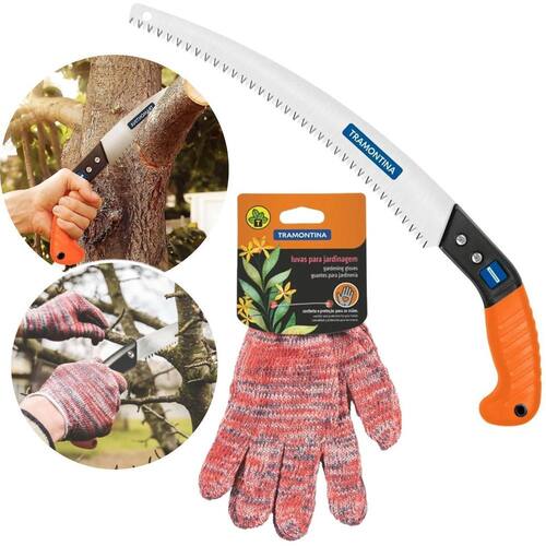 Perfeito para podas em jardim e também como item auxiliar em acampamentos, este kit acompanha um par de luvas que protegem as mãos e garantem maior segurança durante o manuseio.
