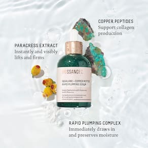 - Encanamento visível + firmamento – Enriquecido com um complexo de preenchimento rápido, este sérum possui ácido hialurônico, ácido poliglutâmico e óleo de esqualano da cana-de-açúcar. Estes ingredientes trabalham juntos para absorver e reter a umidade, proporcionando uma pele visivelmente firme.
