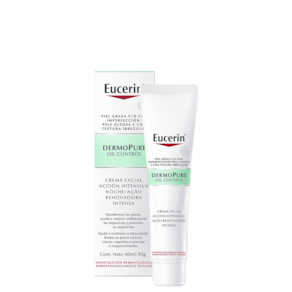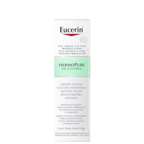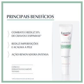 O Sérum Eucerin DermoPure Oil Control Ação Renovadora possui 10% Complexo Hidroxiácidos: uma efetiva combinação de agentes renovadores composta por Ácido Glicólico, Ácido Salicílico e Gluconolactona que ajudam a restaurar as imperfeições causadas pela acne, desobstruir os poros e remover as células mortas da pele. Além disso, também ajuda a controlar a oleosidade, reduz os poros visíveis, cravos, espinhas e previne o seu reaparecimento. Seu uso reduz 49% dos cravos e espinhas, com resultados a partir da primeira semana de uso.