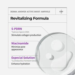 - AMPULA CNP DERMA ANSWER ACTIVE BOOST (30 ml/1,01 fl oz) - A CNP Derma Answer Active Boost Ampule rejuvenesce a pele ao combater os sinais de envelhecimento, aumentar a elasticidade e diminuir a aparência das linhas finas, revelando uma aparência jovem em apenas 4 semanas.
