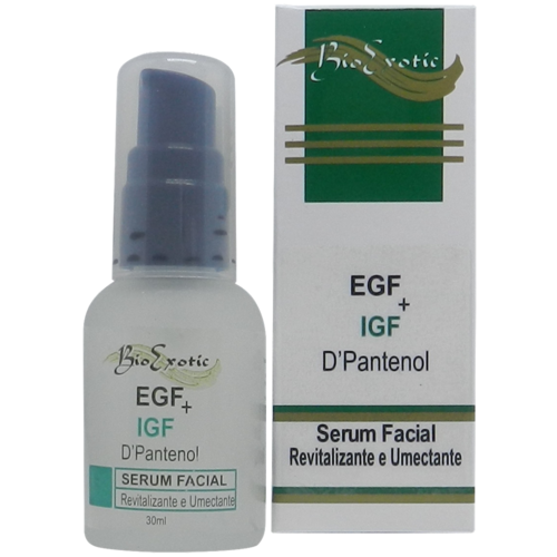 Serum Facial Com Fator De Crescimento 30g- Bioexotic EGF + IGF + Betaglucam Anvisa: .Nº 25351.282256/2017-71 Serum Facial, contendo Fatores de Crescimento Epidermal EGF e Insulínico IGF , D.Pantenol, Hidroviton e Betaglucan. A associação desses ativos em sinergia, repara, hidrata e revitaliza a pele bem como auxiliam tambem no estimulo a renovação celular, produção de colágeno e clareamento de manchas. vol. 30ml Ean: 7898561570857