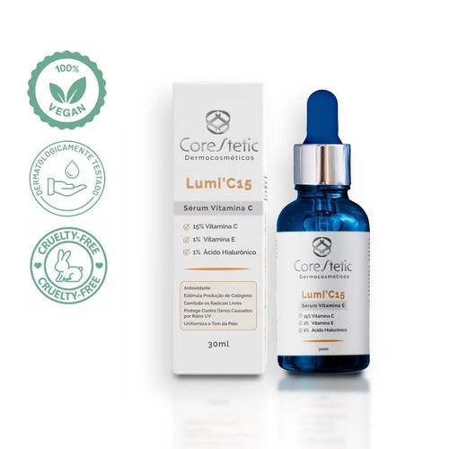Sérum lumic15, enriquecido com um blend de vitamina c, que impulsiona a firmeza da pele ao estimular a produção de colágeno. Este sérum combate os radicais livres, ilumina manchas, reduz linhas finas de expressão, atua como antioxidante e protege a pele contra os danos causados pelos raios uv. Componentes ativos: Vitamina c: possui propriedades antioxidantes, neutralizando os radicais livres que causam danos à pele e aceleram o envelhecimento. Essencial para a produção de colágeno, promovendo firmeza e elasticidade. Trata e previne problemas comuns, como manchas escuras, hiperpigmentação, rugas e linhas finas. Vitamina e: antioxidante, e hidratante. Combate os radicais livres, conferindo brilho e luminosidade à pele. Potencializa os efeitos da vitamina c. Ácido hialurônico: destaca-se pela ação hidratante, preenchendo o espaço intercelular. Confere à pele um aspecto rejuvenescido pelo intumescimento do ativo por água. Torna a pele mais macia e suave, atuando tanto na superfície quanto nas camadas mais profundas. Principais benefícios: Antioxidante Estimula a produção de colágeno Combate os radicais livres Protege contra danos causados por raios uv Uniformiza o tom da pele Modo de uso Uso diário, manhã e noite. Com a pele limpa e seca, aplique 5 cinco gotas do produto no rosto e pescoço, espalhando até completa absorção. Use protetor solar heal sun fps60 após o uso diurno. Composição Aqua água , ascorbic acid ácido ascórbico , glycerin glicerina , sodium hyaluronate hialuronato de sódio , tocopheryl acetate acetato de dextroalfatocoferol , dicaprylyl carbonate carbonato de dicaprilil , cellulose gum carmelose sódica , sodium benzoate benzoato de sódio , potassium sorbate sorbato de potássio , parfum perfume disodium edta edetato dissódico di-hidratado .