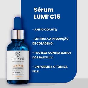 Sérum lumic15, enriquecido com um blend de vitamina c, que impulsiona a firmeza da pele ao estimular a produção de colágeno. Este sérum combate os radicais livres, ilumina manchas, reduz linhas finas de expressão, atua como antioxidante e protege a pele contra os danos causados pelos raios uv. Componentes ativos: Vitamina c: possui propriedades antioxidantes, neutralizando os radicais livres que causam danos à pele e aceleram o envelhecimento. Essencial para a produção de colágeno, promovendo firmeza e elasticidade. Trata e previne problemas comuns, como manchas escuras, hiperpigmentação, rugas e linhas finas. Vitamina e: antioxidante, e hidratante. Combate os radicais livres, conferindo brilho e luminosidade à pele. Potencializa os efeitos da vitamina c. Ácido hialurônico: destaca-se pela ação hidratante, preenchendo o espaço intercelular. Confere à pele um aspecto rejuvenescido pelo intumescimento do ativo por água. Torna a pele mais macia e suave, atuando tanto na superfície quanto nas camadas mais profundas. Principais benefícios: Antioxidante Estimula a produção de colágeno Combate os radicais livres Protege contra danos causados por raios uv Uniformiza o tom da pele Modo de uso Uso diário, manhã e noite. Com a pele limpa e seca, aplique 5 cinco gotas do produto no rosto e pescoço, espalhando até completa absorção. Use protetor solar heal sun fps60 após o uso diurno. Composição Aqua água , ascorbic acid ácido ascórbico , glycerin glicerina , sodium hyaluronate hialuronato de sódio , tocopheryl acetate acetato de dextroalfatocoferol , dicaprylyl carbonate carbonato de dicaprilil , cellulose gum carmelose sódica , sodium benzoate benzoato de sódio , potassium sorbate sorbato de potássio , parfum perfume disodium edta edetato dissódico di-hidratado .