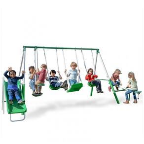 O conjunto de balanço metálico Sportspower Park Ridge é fabricado em aço com pintura eletrostática na cor verde e detalhes em branco, proporcionando alta resistência à corrosão e durabilidade para uso externo. Possui capacidade para até 8 crianças simultaneamente, suportando peso máximo total de 363 kg, com limite individual de 45 kg por usuário. O conjunto inclui dois balanços moldados, um balanço moldado em pé, um balancim romano para duas pessoas, gangorra (teeter totter) e escorregador ondulado de 1,52 metros.As correntes dos balanços são revestidas em PVC para maior conforto e segurança na manipulação, evitando pinçamentos. As pernas do quadro possuem espuma acolchoada para proteção adicional. O kit de quatro peças para âncoras facilita a fixação segura do conjunto no solo. Recomendado para crianças de 3 a 8 anos e atende às normas ASTM e CPSIA de segurança. Montagem requerida.