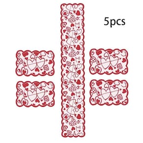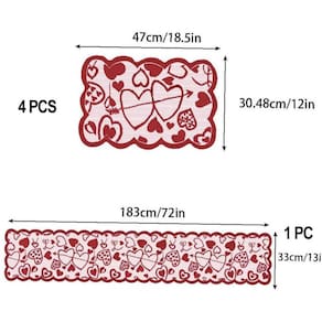 Valentim Heart Lace Placemats And Table Runner Set-> Heart to Heart Design-> Create Romantic Atmosphere-> Multipurpose *** Table Runner And 4 Placemats Set *** Valentine Lace Red Heart Theme -----------------------------------> Especificações: Material: Fibra de poliéster Table Runner Tamanho: aprox. 33 x 183 cmTamanho dos placemats: 30 x 45 cmCor: vermelho->O pacote inclui: 1 x Lace heart table runner4 x Lace heart placemats->Notas quentes: Lavável à máquina, mas melhor em uma lavanderia de saco de armazenamento. Por favor, meça sua mesa antes de fazer o pedido. Pode ser passado a ferro a baixa temperatura.------------------------------- ----> Heart to Heart DesignValentine's Day table runner apresenta corações vermelhos conectivos, fáceis de mostrar o seu amor às famílias ou querida; Boas decorações para jantares à luz de velas e jantares festivos, deixando uma profunda impressão um no outro.-> Crie uma atmosfera romântica A toalha de mesa de coração vermelho de renda pode facilmente adicionar uma sensação aconchegante à sua mesa, ajudando você a ter um jantar feliz à luz de velas ou uma festa de aquecimento da casa.->MultiusoVocê pode usar o corredor de mesa de renda para decorar sua casa no Dia dos Namorados, Dia das Mães, casamento, aniversário de casamento, propostas de casamento, compromissos, etc. Você também pode usá-lo como lenço, mesa de centro e toalha de mesa de entrada da frente, etc. Ou um bom presente para férias e aquecimento da casa.