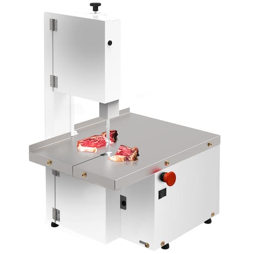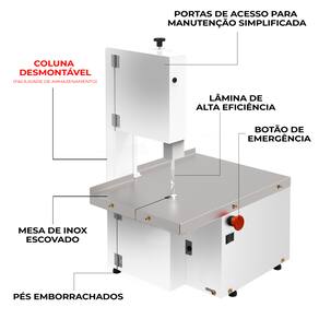 CARACTERÍSTICAS: - Única com regulador de velocidade industrial integrado. - Possui sistema de segurança integrado com paralisação total. - Coluna desmontável para fácil transporte e montagem. - Fabricada 100% de Inox próprio para o contato com alimentos. - Acompanha lâmina de serra resistente e de alta durabilidade. - Possui estrutura robusta em aço carbono inoxidável. - Motor de alta tecnologia com placa integrada e 1/3 cv de potência. - Sistema tecnológico RED-Plus, capaz de aumentar a vida útil do motor e diminuir sua manutenção.
