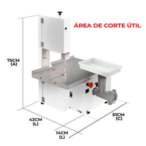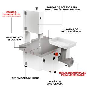 CARACTERÍSTICAS: - Regulador de Velocidade Industrial Integrado - Sistema de Segurança Integrado - Coluna Desmontável - Construção em Aço Inoxidável - Lâmina de Serra Resistente - Estrutura Robusta - Motor de Alta Tecnologia - Sistema Tecnológico RED-Plus - Moedor Integrado