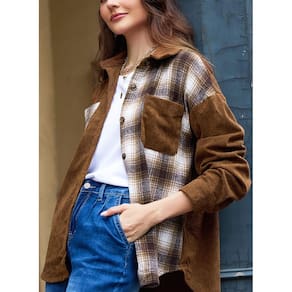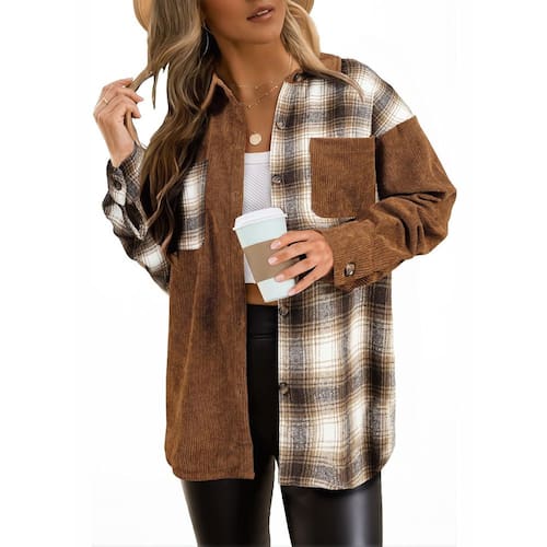 Astylish Blusa feminina de veludo cotelê color block manga comprida abotoada, Marrom - Material: camisa de veludo cotelê astylish é feita com tecido de alta qualidade. Tecido de veludo cotelê super macio e leve para mulheres - Característica: tecido de veludo cotelê; bloco de cor xadrez; fecho de botão frontal; dois bolsos no busto; mangas compridas com punhos de botão; estilo namorado; gola virada para baixo; camisas folgadas - Combinado: esta camisa color block é fácil de combinar com uma variedade de regatas; cami; saias; jeans; shorts de cintura alta; sapatos de salto alto; colar e brincos; dando a você um visual atemporal e elegante - Ocasião: esta jaqueta xadrez de veludo cotelê é a escolha perfeita para o dia a dia; férias; viagens; ambiente de escritório ou trabalho; casa, encontros. É um presente ideal para amigas; mãe; esposa - Conteúdo da embalagem: uma camiseta feminina. Cuidados com a roupa: lavagem à mão recomendada, lavar à máquina com água fria, não usar alvejante