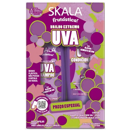 Descubra o poder da natureza com o Kit Skala Frutástica Uva! Composto por shampoo e condicionador, sua fórmula rica em óleo de semente de uva é 100% vegana, sem sal e dermatologicamente testada. Ideal