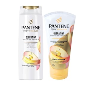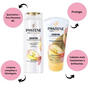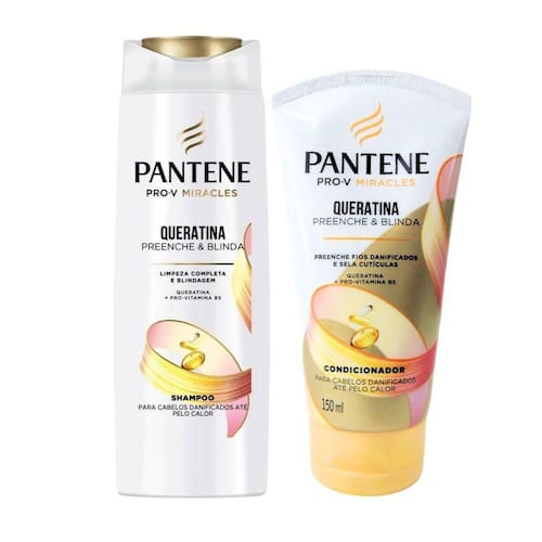 . O Shampoo e Condicionador Pantene Pro-V Queratina Preenche e Blinda, possuem uma Fórmula Pro-V Miracles com Queratina. O shampoo penetra no cabelo, fazendo uma limpeza e blindagem que protege, enquanto o condicionador identifica e preenche os fios danificados, para alinhar e selar, facilitando o desembaraço. Use a linha completa Preenche e Blinda para uma reparação contra danos causados até pelo calor. Cabelos mais resistentes e brilhantes. Fórmula que não pesa com queratina e pro-vitamina b5, para cabelos danificados.