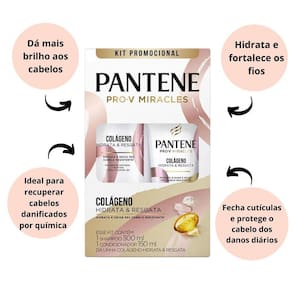 Inspirados nos benefícios mais renomados do mundo junto ao poder da Pro-Vitamina B5, os produtos Pantene Pro-V Miracles Colágeno Hidrata e Resgata te ajudarão com a nutrição capilar da raiz até as pontas, graças a uma poderosa fórmula com colágeno; Pro-Vitamina B5 e Biotina que protege o cabelo dos danos associados às constantes transformações.