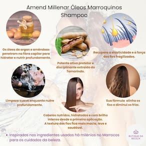 Somos a butique da beleza Uma empresa especializada no comércio de cosméticos e semijoias. Estamos sempre entre os melhores vendedores. Nosso compromisso é com você Seu conforto e segurança são nossos propósitos Servir e ajudar são nossos deveres Shampoo amend óleos marroquinos Se seus cabelos estão ressecados, opacos e sem vida, o shampoo amend óleos marroquinos é a escolha ideal para restaurar o brilho, a maciez e a saúde dos fios. Formulado com óleos preciosos de argan e amêndoas, ele proporciona uma limpeza suave enquanto nutre profundamente, deixando seus cabelos hidratados e revitalizados desde a primeira aplicação. Indicado para qual tipo de cabelo Perfeito para cabelos secos, danificados, opacos ou com frizz, que necessitam de nutrição intensa, proteção e hidratação profunda. Benefícios Nutrição avançada: os óleos de argan e amêndoas são ricos em ácidos graxos e vitaminas, que penetram na fibra Capilar para hidratar e nutrir profundamente. Hidratação duradoura: ajuda a manter a umidade natural dos fios, deixando-os mais macios e menos propensos ao ressecamento. Redução do frizz: sela as cutículas dos cabelos, eliminando o frizz e proporcionando um visual mais alinhado e disciplinado. Reparação de danos: ajuda a recuperar a elasticidade e a força dos fios fragilizados por agressões externas ou Químicas. Brilho saudável: realça o brilho natural dos cabelos, deixando-os mais luminosos e com aspecto saudável. Limpeza suave: remove impurezas sem agredir os fios, preparando-os para absorver melhor os nutrientes dos tratamentos seguintes. Proteção contra danos externos: forma uma camada protetora contra os efeitos nocivos do sol, poluição e ferramentas térmicas. Resultados Cabelos nutridos, hidratados, livres de frizz e com brilho intenso desde a primeira aplicação. A textura dos fios fica mais macia, leve e saudável. Modo de uso Aplique nos cabelos molhados, massageando suavemente o couro cabeludo e os fios até formar espuma. Enxágue completamente e, se necessário, repita a aplicação. Dica da butique da beleza Para potencializar os resultados, use em conjunto com o condicionador e a máscara amend óleos marroquinos e garanta um tratamento completo para cabelos ainda mais saudáveis e deslumbrantes Dúvidas frequentes Esse shampoo serve para cabelos oleosos Embora seja indicado principalmente para cabelos secos e danificados, pode ser em cabelos oleosos nas pontas e secos no comprimento. Se o couro cabeludo for muito oleoso, intercale com um shampoo específico para controle da oleosidade. O shampoo pesa nos fios finos Não a fórmula é nutritiva, mas leve o suficiente para não deixar os fios finos pesados. Ele hidrata sem comprometer o volume natural. Posso usar todos os dias Sim ele é indicado para uso frequente, mas a frequência ideal depende da necessidade dos seus fios. Para cabelos muito secos, o uso diário pode ser benéfico. Ajuda a reduzir o frizz Sim, a fórmula sela as cutículas, controlando o frizz e deixando os fios mais alinhados e disciplinados. Os óleos deixam o cabelo oleoso Não os óleos presentes no shampoo são absorvidos pela fibra capilar, proporcionando nutrição sem deixar os fios pesados ou oleosos. Se tiver mais dúvidas, fale com a gente estamos prontos para ajudar você a ter cabelos lindos, saudáveis e cheios de vida.