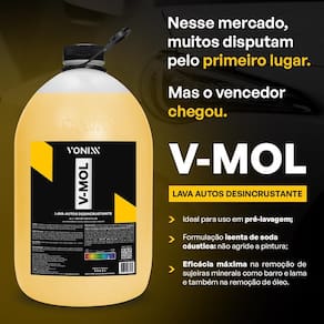 V-MOL é um lava autos biodegradável com pH levemente básico que não agride a superfície. Ideal para lavagem de automóveis, em especial para remoção de sujeiras mais difícieis, como remoção de barro e óleo.