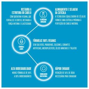 Tecnologia Avançada: traz a nova Tecnologia Vegana (com aminoácidos de trigo e soja) que restaura a força e elasticidade no interior do Córtex; e o Equalizador de Células – com uma ação externa que alinha e sela a cutícula capilar.