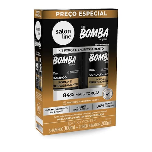 O Kit SOS Bomba Força e Engrossamento da Salon Line foi desenvolvido especialmente para cabelos finos, ralos e quebradiços, promovendo fios mais grossos em apenas 3 usos. Com uma fórmula poderosa e testada, garante fios 19% mais espessos e 84% menos quebra, fortalecendo e revitalizando a fibra capilar. Além de deixar os cabelos visivelmente mais densos e encorpados, reduz a quebra e aumenta a resistência capilar, deixando os fios mais volumosos saudáveis e protegendo contra danos e quedas causadas por fraqueza, mantendo os cabelos nutridos, macios e brilhantes.