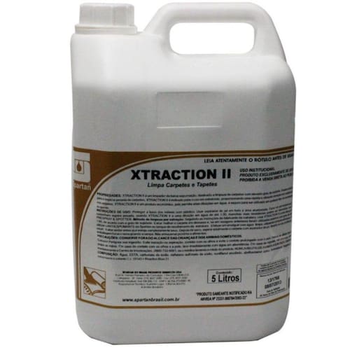 Propriedades:Xtraction II é um limpador concentrado de baixa espumação, destinado a limpeza de carpetes com elevado grau de sujidade.Indicado para uso em Lavadoras/Extratoras Desenvolvido especialmente para limpeza pesada de carpetes, Xtraction II é indicado para o uso em extratoras, proporcionando uma rápida e eficiente remoção das sujidades mais aderidas nos carpetes.Xtraction II é um produto econômico, pois permite altas diluições em água, é seguro para ser utilizado em qualquer tipo de extratoras com água fria ou água quente.Instruções de uso:- Proteger a base dos móveis com plástico.- Usar o aspirador de pó em toda a área acarpetada.- Fazer um pré-tratamento nas áreas que contenham sujeira pesada, usando o Xtraction II a uma diluição em água de até 1:30, manchas mais resistentes podem ser removidas com SSE Carpet prespray & spotter.-Método de limpeza por extração: Seguindo as instruções do fabricante da extratora, usar Xtraction II a uma diluição máxima de até 1:60, de acordo com o grau da sujidade. -Evitar molhar o carpete em demasia. Efetuar um enxágue com água limpa, utilizando a própria extratora.-Deixar o carpete secar. Evitar andar antes que esteja completamente seco.-Depois de seco, aspirar totalmente o carpete com aspirador de pó.Dados Técnicos:Aparência: Líquido transparenteCor: VerdeOdor: CaracterísticopH: 9,5 - 11,4Peso específico: 1,035 - 1,065 g/cm3Viscosidade: 1,0 - 10,0 cpsTeor de ativos: 12,0 - 16,0 %Garantia:Produção moderna e rigoroso controle de laborátorio asseguram qualidade uniforme por todo o tempo. Assim, todos os produtos manufaturados pela Spartan do Brasil são garantidos para a total satisfação do usuário.Pode ser utilizado em extratoras Karcher, Wap, Soteco , IPC, Electrolux, Jacto e etc..