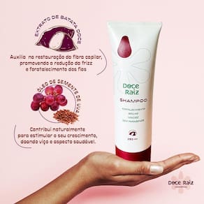 O Shampoo Doce Raiz foi desenvolvido para cuidar dos cabelos de forma natural e eficaz. Sua fórmula com extrato de batata doce ajuda a restaurar a fibra capilar, reduzindo o frizz e fortalecendo os fios desde a raiz. O óleo de semente de uva complementa a ação nutritiva, estimulando o crescimento saudável e devolvendo o brilho e a vitalidade ao cabelo. Com textura leve e agradável, limpa suavemente sem agredir o couro cabeludo, proporcionando uma sensação de frescor e maciez após o uso. Livre de parabenos, é ideal para quem busca um cuidado mais natural e equilibrado para o dia a dia.