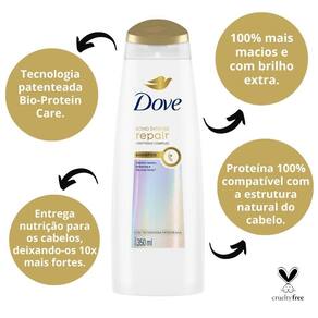 Shampoo Dove Bond Intense Repair 350ml O Shampoo Dove Bond Intense Repair possui a nova tecnologia patenteada Bio-Protein Care, proteína 100% compatível com a estrutura natural do cabelo, que age em harmonia com a biologia capilar e reverte os sinais do dano; e Peptídeo Complex, microcomponentes da proteína que conseguem atingir as camadas mais internas da fibra para restaurar as ligações rompidas a nível molecular. Juntos, reparam os sinais de dano dos fios a nível molecular desde o primeiro uso. Focada em nutrição para cabelo, a fórmula deste shampoo reconstrutor possui uma textura cremosa que limpa em profundidade enquanto repara a fibra capilar, para cabelos macios, saudáveis e brilhantes. O shampoo Dove Bond Intense Repair entrega nutrição para os cabelos, deixando-os 10x mais fortes, 100% mais macios e com brilho extra. Modo de uso: Massageie sobre os cabelos molhados e enxágue. Aplique novamente se necessário. Para melhores resultados, experimente também outros produtos para cabelos Dove Bond Intense Repair. Advertências: Manter em local fresco, ao abrigo de luz intensa e fora do alcance de crianças. Não ingerir. Em caso de contato acidental com os olhos, lavar abundantemente. Havendo irritação, suspenda o uso e procure orientação médica. Marca: Não Informado Ean: 7891150095588