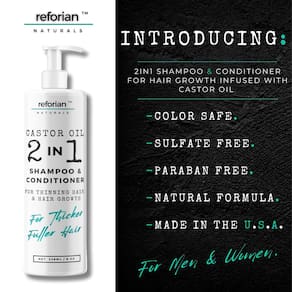 - O xampu e condicionador de óleo de rícino 2 em 1 é um tratamento ideal para crescimento de cabelo para homens e mulheres. Infundido com óleo de rícino puro, nutre profundamente e fortalece o cabelo fino da raiz às pontas, promovendo o crescimento do cabelo, o volume e reduzindo a quebra. Obtenha um cabelo mais espesso e saudável a cada lavagem.