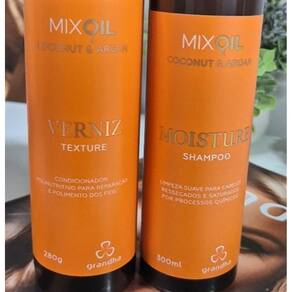 Condicionador verniz texture mix oil coconut & argan Máscara capilar hidratante com ampla capacidade polinutritiva e doadora de brilho. A sinergia dos óleos de coco e argan estabelece maior potencial antioxidante, em função das altas taxas de vitamina e e ácidos graxos essenciais, os quais diminuem o desgaste provocado por processos químicos e restabelecem a integridade dos cabelos. Não há contraindicações. Controle hidrolipídico dos fios. Brilho e sedosidade com ação antioxidante. Verniz texture de grandha é um condicionador polinutritivo para reparação e polimento dos fios. Toda a linha mix oil coconut & argan é ideal para o pós-praia ou piscina e também para cabelos fragilizados por processos químicos. o kit mix oil coconut & argan é rico em antioxidantes, pois conta com óleo de coco e óleo de argan em sua composição. Atua de forma a desacelerar o envelhecimento natural dos cabelos, proporcionando um brilho incrível, além do frescor do cheirinho de coco.