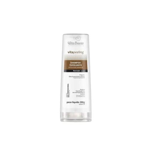 Vita Derm Vita Peeling Esfoliante Shampoo antirresíduo para todos os tipos de cabelo. vita Derm Vita Peeling Esfoliante higieniza profundamente os fios e o couro cabeludo, além de potencializar o resultado final dos demais tratamentos cosméticos capilares.