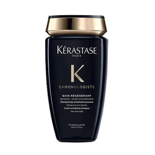 Shampoo Kérastase Chronologiste Bain Régénérant é enriquecido com Ácido Hialurônico, Abyssine e Vitamina e, uma fórmula que revitaliza o cabelo e remove gentilmente as impurezas do couro cabeludo e dos fios.