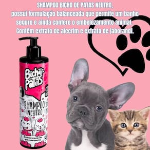 Shampoo neutro bicho de patas para pet - suave e hidratante Shampoo bicho de patas neutro, possui formulação balanceada que permite um banho seguro e ainda confere o embelezamento animal. Contém extrato de alecrim e extrato de jaborandi. Modo de usar: aplique o shampoo por toda a pelagem molhada do pet e massageie-a. Em seguida enxágue bem. Repita a operação se necessário, para melhores resultados finalize com o condicionador bicho de patas. Composição: água, laurel éter sulfato de sódio, cocoamidopropilbetaína, amida, polyquaternium 7, diestearato de peg6000, extrato de alecrim, extrato de jaborandi, fragrância e conservante. Precauções: uso externo. Mantenha em local seco, arejado e longe da luz solar. Mantenha fora do alcance de crianças, animais domésticos, longe de alimentos, medicamentos e produtos domésticos, longe de alimentos, medicamentos e produtos domésticos ou higiene pessoal. Marca: Não Informado Ean: 7903331698218