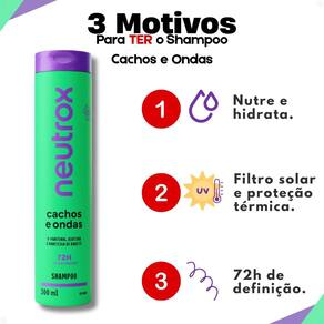 Ocasiões de Uso/Cenários Ideais O Shampoo Neutrox Cachos e Ondas 300ml é o aliado perfeito para o dia a dia, seja para manter a definição dos cachos em um compromisso importante, para um encontro casual ou para simplesmente realçar a beleza natural dos seus cabelos em casa. Ideal para todas as ocasiões em que você deseja exibir cachos e ondas impecáveis e cheios de vida.