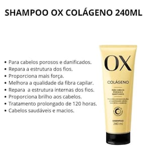 O Shampoo Ox Colágeno 240ml foi desenvolvido para fortalecer e revitalizar os cabelos, proporcionando uma limpeza suave e eficaz. Enriquecido com colágeno, conhecido por suas propriedades de fortalecimento e hidratação, este shampoo ajuda a restaurar a elasticidade dos fios, deixando-os mais resistentes à quebra e com um aspecto saudável. Ideal para cabelos que necessitam de cuidados especiais para manter a vitalidade e o brilho natural.Modo de UsoAplique o Shampoo Ox Colágeno nos cabelos molhados, massageando suavemente o couro cabeludo e os fios até formar espuma. Deixe agir por alguns minutos para que o colágeno possa penetrar na fibra capilar. Enxágue bem. Use regularmente para melhores resultados e complemente o cuidado com o condicionador da mesma linha.
