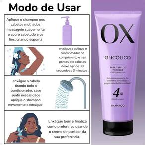A linha Ox Glicólico é ideal para cabelos porosos e sem brilho. O Glicolic complex combinado ao sistema OX Bela Duradoura é a fórmula certa para selar intensamente os fios, combater a porosidade e proporcionar brilho imediato. O SISTEMA OX é uma tecnologia exclusiva, capaz de liberar sequencialmente os ingredientes, proporcionando um tratamento prolongado aos fios.Modo de UsoAplique o Shampoo Ox nos cabelos molhados massageando-os por alguns minutos. Enxágue e repita a aplicação.Após lavar o cabelo com o Shampoo, aplique um Condicionador nos cabelos ainda molhados, do comprimento às pontas. Deixe agir por alguns minutos e, em seguida enxágue.