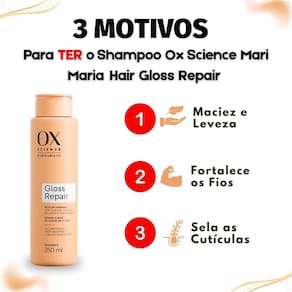 Shampoo Ox Science Mari Maria Hair Gloss Repair 250ml O Shampoo Ox Science Mari Maria Hair Gloss Repair 250ml limpa suavemente os fios enquanto inicia o tratamento reparador da linha Gloss Repair. Com tecnologia avançada e ativos poderosos como Óleo de Linhaça Dourada, Niacinamida e Algas Marinhas, ele atua desde a primeira lavagem para restaurar a fibra capilar, reduzir o frizz e devolver o brilho intenso e o toque macio aos cabelos. Desenvolvido pela parceria entre OX e Mari Maria Hair, o shampoo promove uma limpeza eficaz sem agredir os fios, deixando-os leves, soltos e com aspecto saudável.