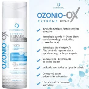O Shampoo Ozonio OX Extreme Repair da Cosmobeauty foi desenvolvido para fortalecer os fios e suavizar a queda capilar. Com ozônio e ativos reconstrutores, limpa suavemente e melhora a aparência dos cabelos. Sua fórmula promove toque macio e brilho natural. Indicado para uso frequente em cabelos enfraquecidos e quimicamente tratados. Pode ser utilizado diariamente para manter a saúde capilar.