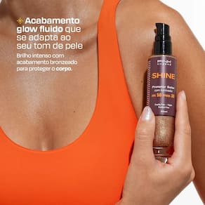 Shining like the sun’ — é assim que você vai se sentir com o PROTETOR SOLAR ILUMINADOR CORPORAL SHINE. Com partículas douradas de brilho, ele protege sua pele enquanto deixa um acabamento glow super radiante, seja para brilhar nos treinos ou para levar mais elegância para o look daquele evento especial.