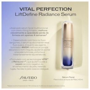 O Sérum Shiseido Vital Perfection LiftDefine Radiance apresenta uma fórmula que foca em agir em todos os tipos de mudanças relacionadas à idade: rugas em volta dos olhos, boca e pescoço, flacidez na linha do maxilar, tom de pele irregular, pontos escuros e pele opaca.