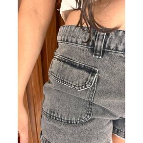 O short é uma peça jeans de lavagem escura e cintura alta. Ele tem um corte mais curto, com a barra desfiada e algumas costuras visíveis na parte frontal, que ajudam a modelar a peça. O design inclui bolsos grandes e utilitários, e o fechamento parece ser por zíper e botão. Marca: Não Informado