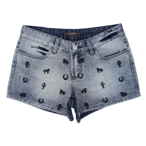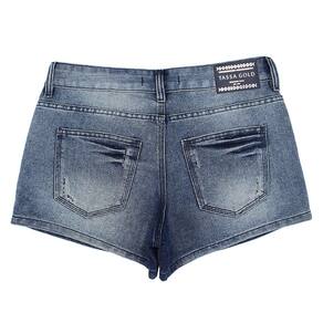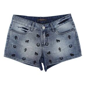 Short Tassa Gold Feminino Confort, confeccionada em tecido Jeans 65% Algodão e 35% poliéster cor Azul Escuro, com detalhes bordados em alta definição, cintura baixa, 2 bolsos frontais e 2 traseiros e fechamento em botão personalizado.